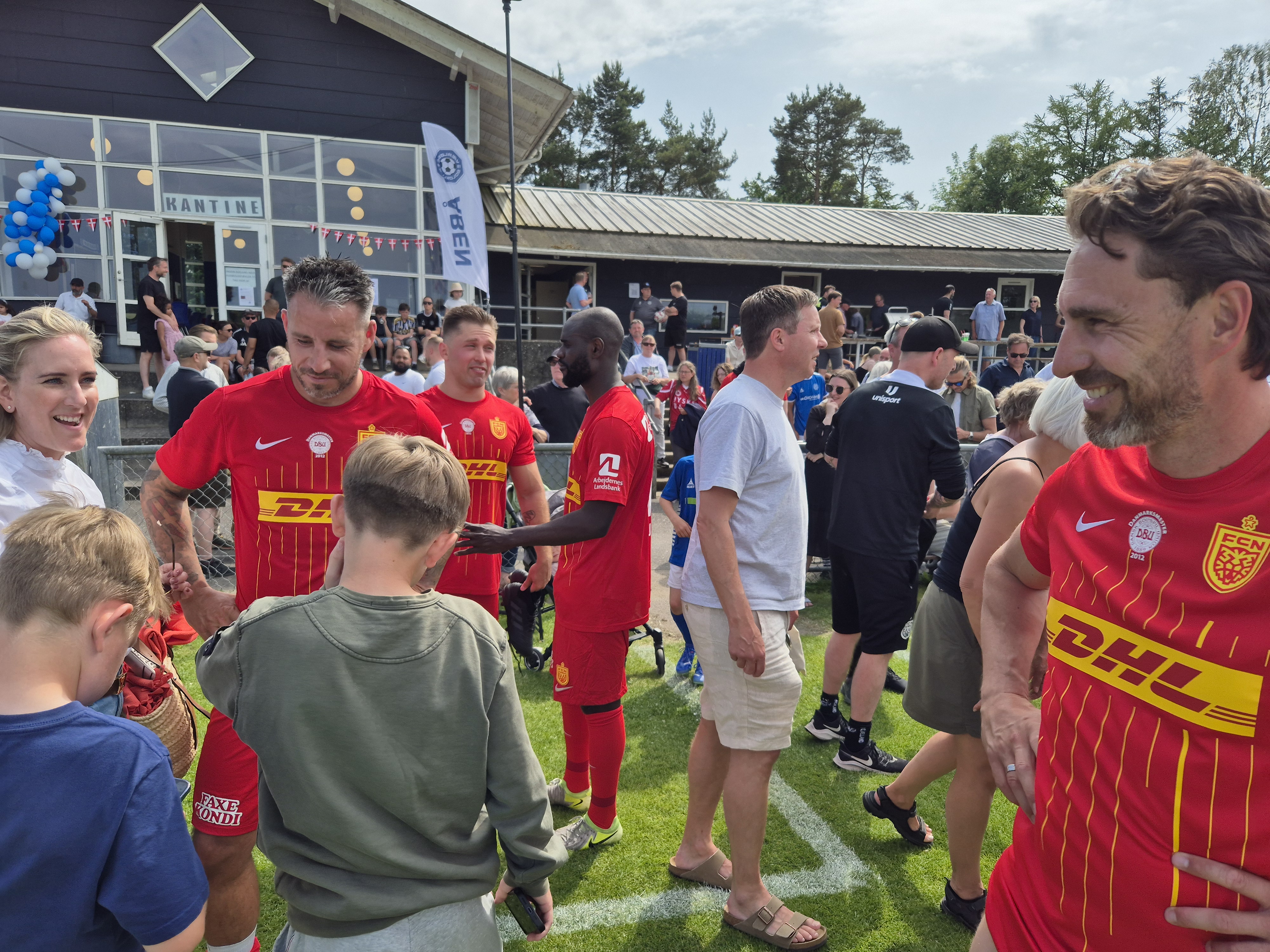 På samme tid blev der udenfor på bane 1 varmet op til dagens jubilæumskamp kl. 13.30, hvor Værløses førstehold, der til daglig spiller i Serie 1, mødte et helt hold danmarksmestre, nemlig FC Nordsjællands DM guldvindere fra 2012 med anfører Nicolai Stokholm i spidsen.